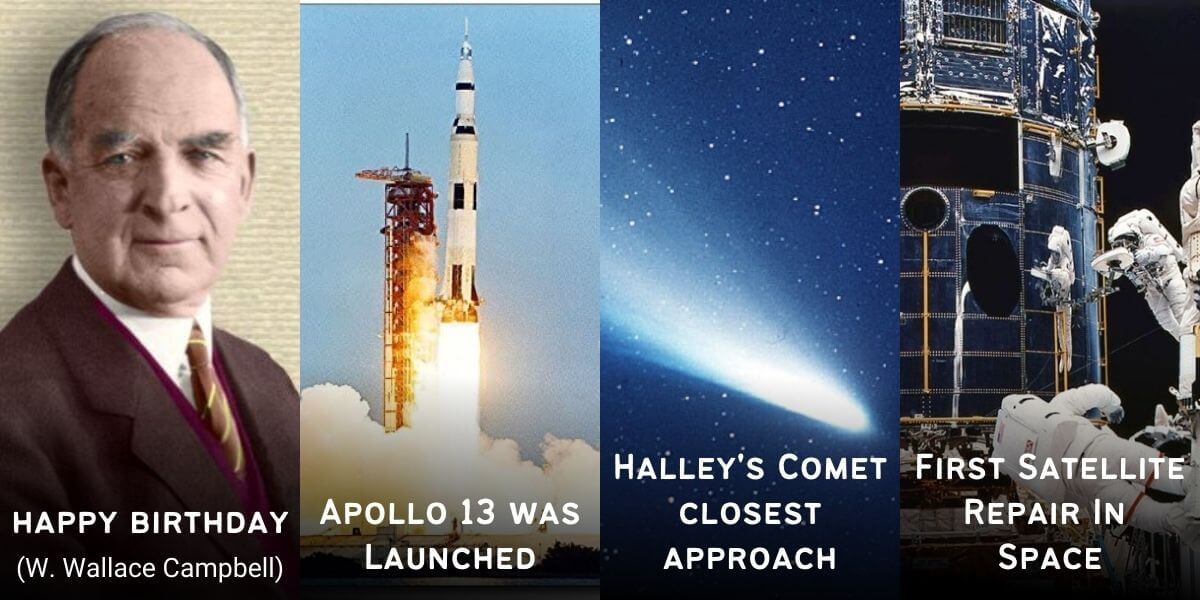 Apollo 13 was the third manned lunar landing mission. On this day, it was launched in 1970 from Cape Canaveral with crew Fred Haise, John Swigert, and James Lovell. Two days later, a liquid oxygen tank exploded and disabled the normal supply of oxygen, light, electricity, and water. The mission was aborted and the spacecraft circled the moon and began a long journey back to Earth. On 17 April, they safely touched down in the Pacific Ocean.